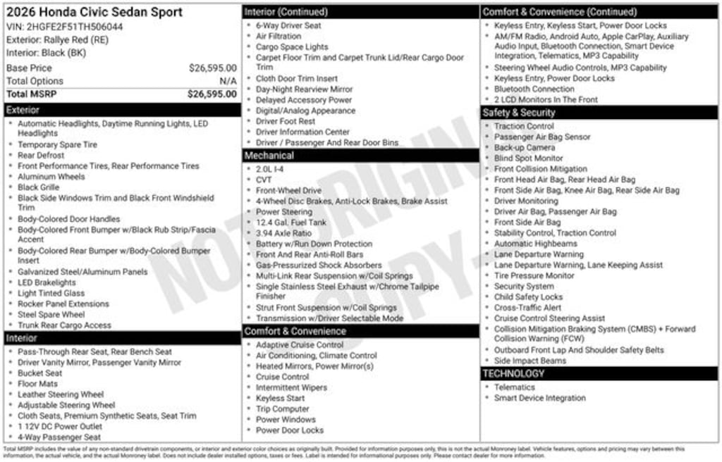 2026 Honda Civic Sport Rallye Red 2.0L I4 DOHC 16V FWD CVT
