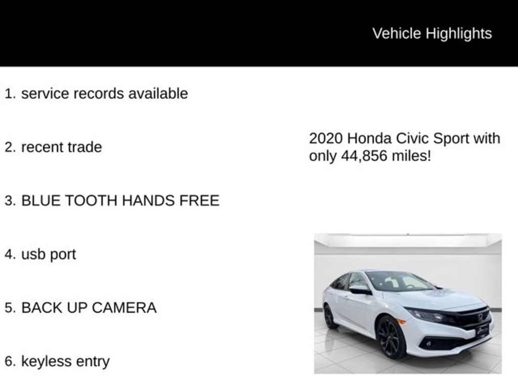 Don't miss out on this exceptional opportunity to own a 2020 Honda Civic Sport. Schedule a test drive today and experience the perfect blend of performance, technology, and style.