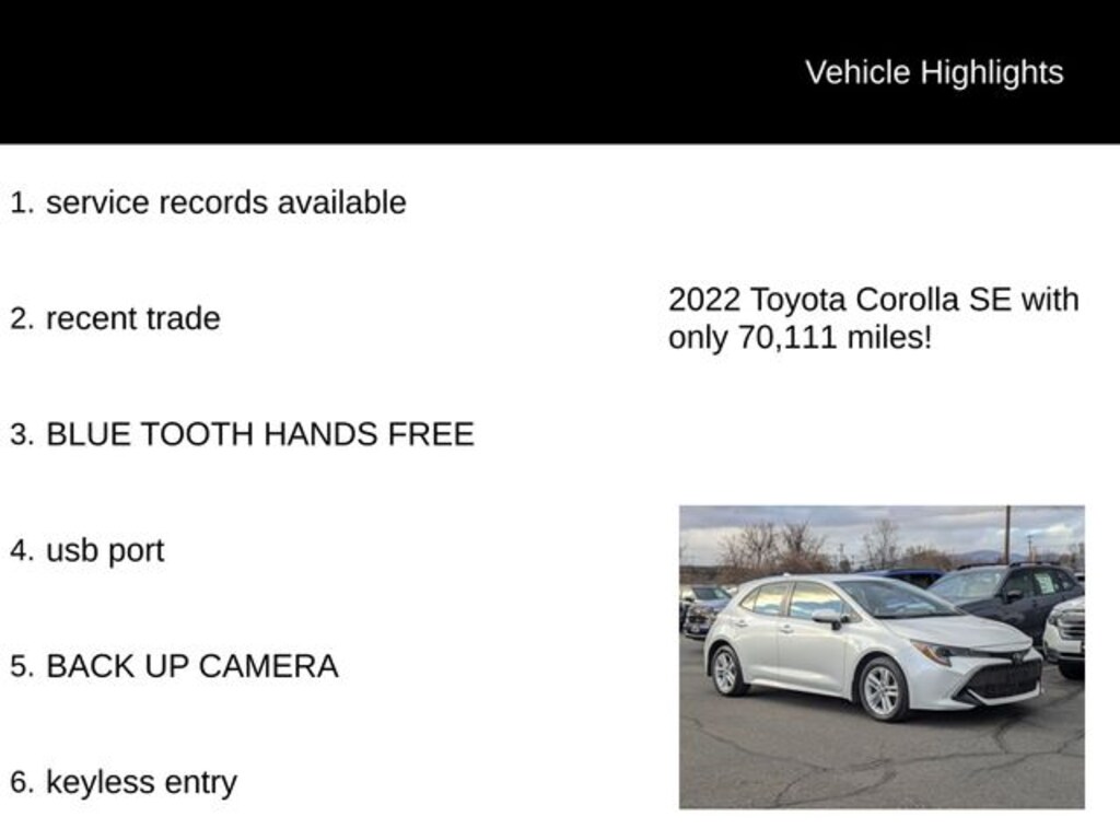 At our dealership, we pride ourselves on providing our customers with a seamless and enjoyable car-buying experience. Our knowledgeable sales team is dedicated to helping you find the perfect vehicle to suit your needs and budget. We invite you to schedule a test drive and discover the exceptional value and performance of this 2022 Toyota Corolla Hatchback SE.